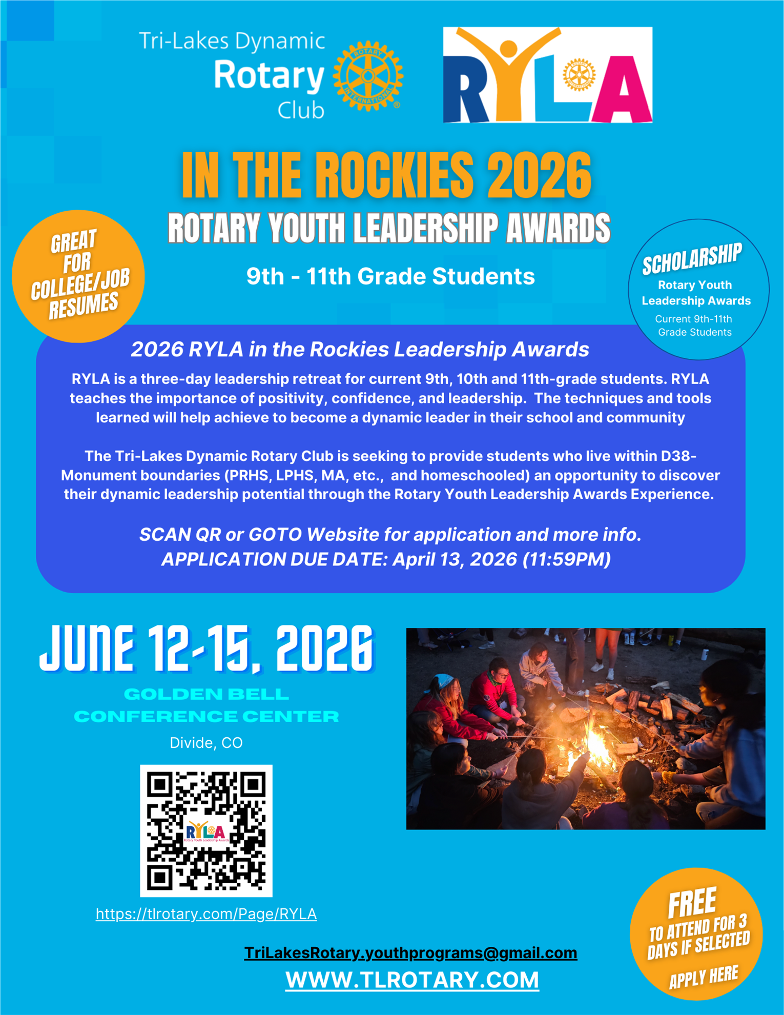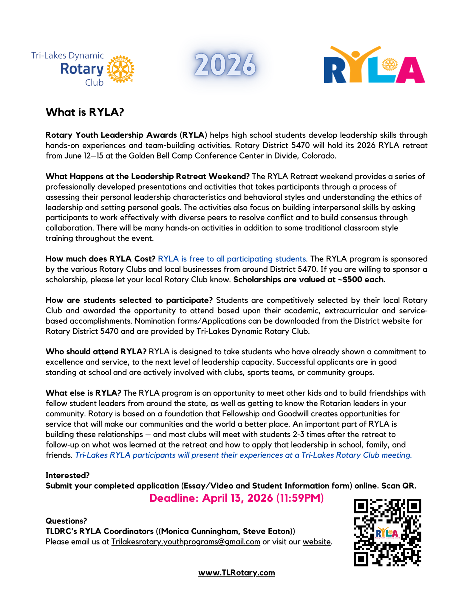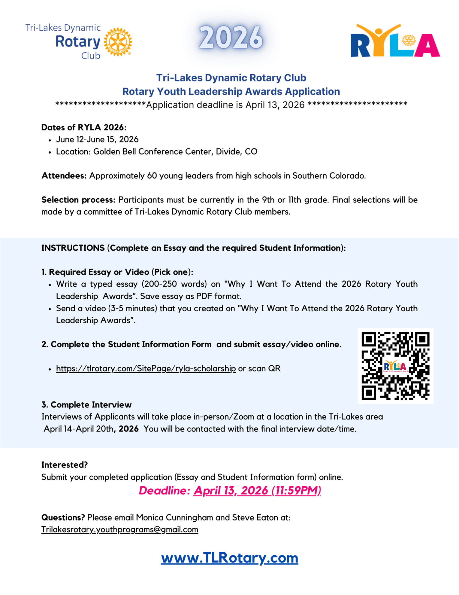 Selection process: Participants must be currently in the 9th, 10th or 11th grade. Final selections will be made by a committee of Tri-Lakes Dynamic Rotary Club members.